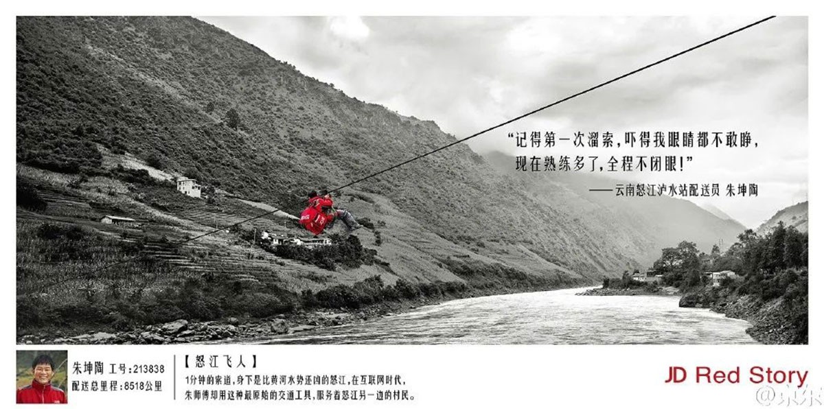 像農(nóng)夫山泉在2014、2015年就投放過水源勘探師探尋水源地的故事,西藏拉薩的業(yè)務(wù)代表鋪貨送水的故事。京東也傳播過邊遠地區(qū)配送員的故事。這些都是很好的品牌故事。